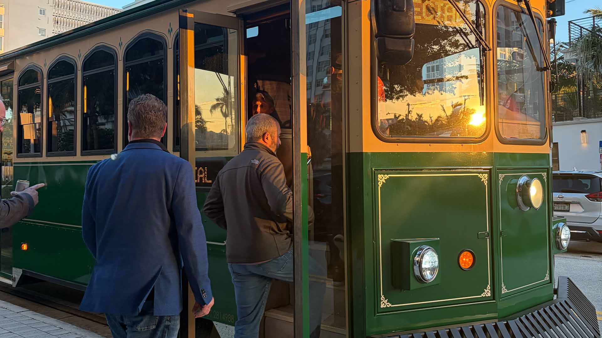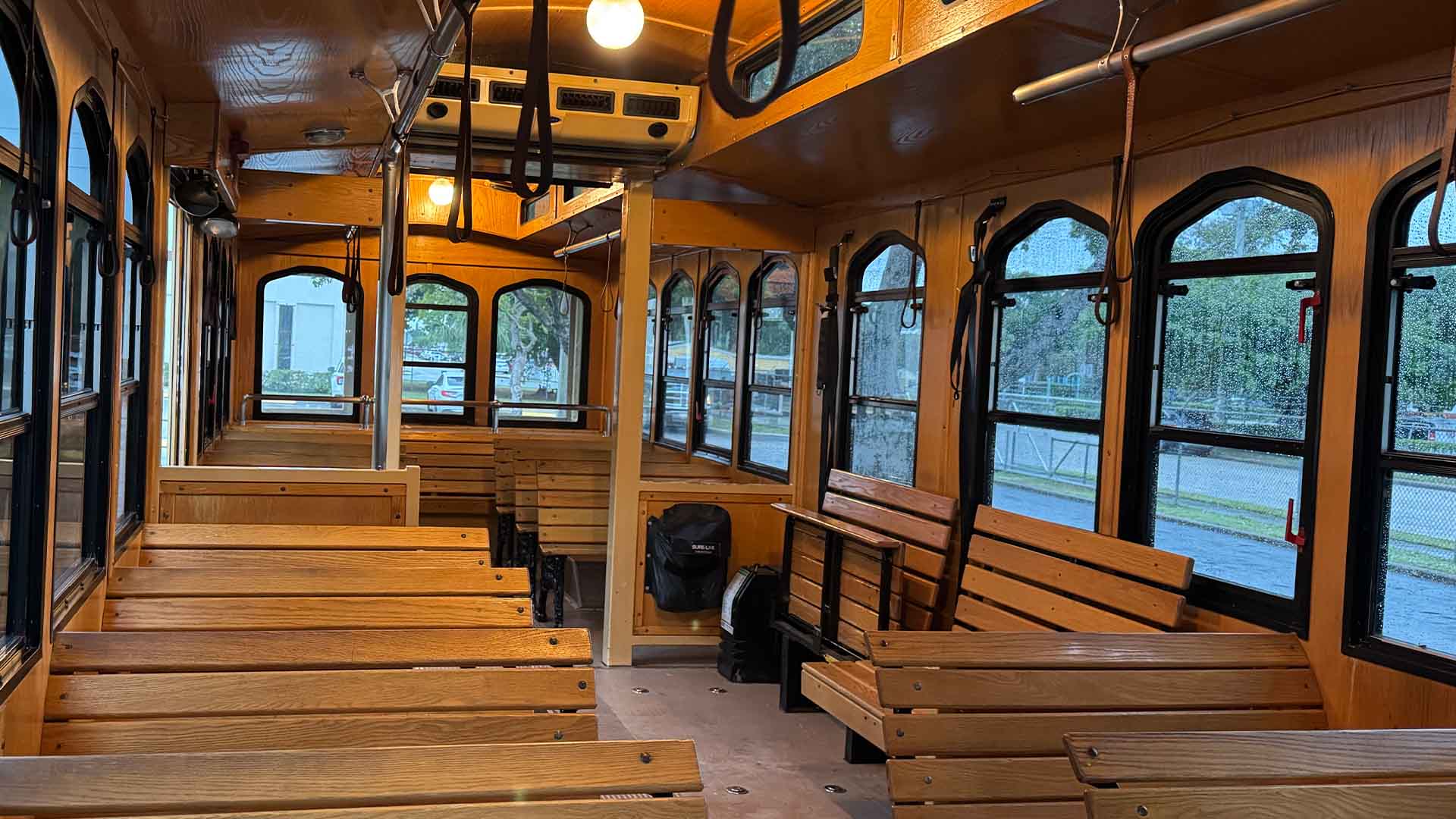The green trolley brings timeless vintage character to your event. Fully enclosed with air conditioning, it offers a comfortable ride for guests while standing out in every photo.