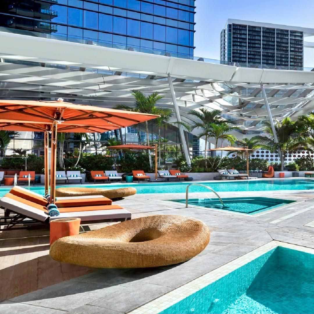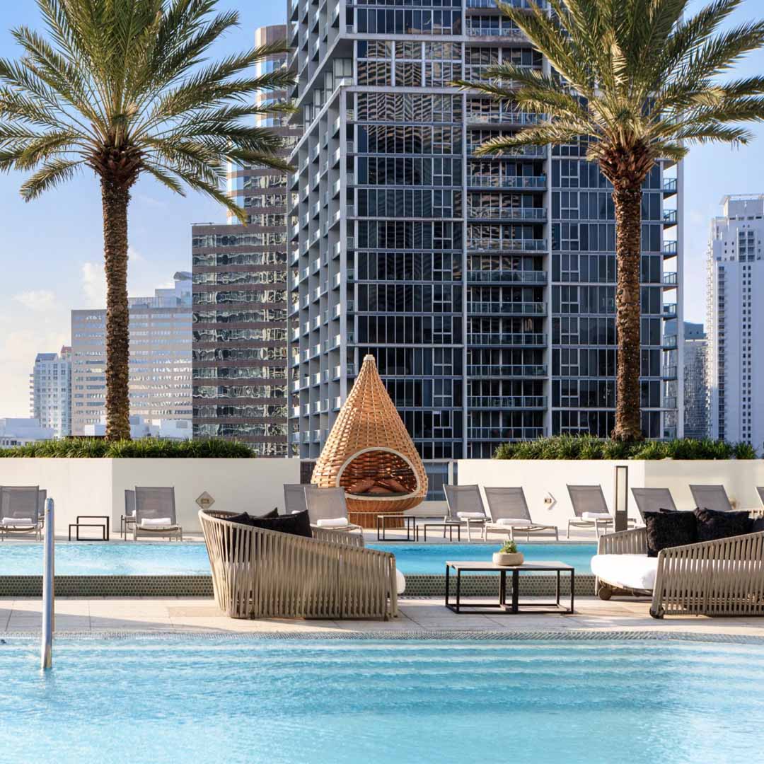 Luxury hotel / rooftop venueA stylish waterfront hotel located where the Miami River meets Biscayne Bay, featuring rooftop venues and panoramic skyline views.