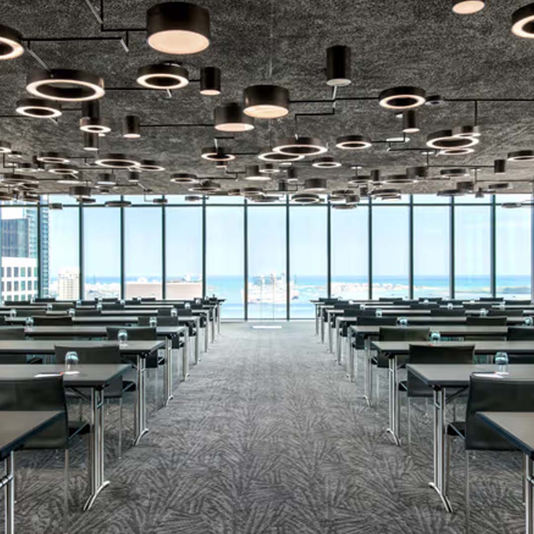 A modern luxury hotel known for its dramatic skyline views and upscale spaces for private events and celebrations.